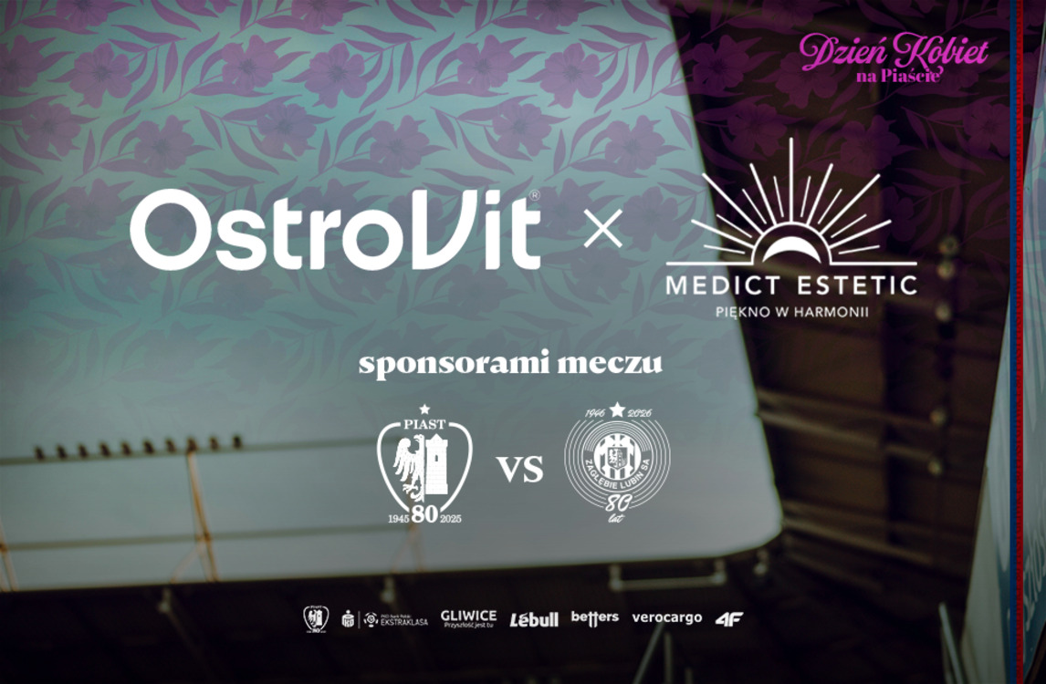Informujemy, że sponsorami meczu 24. kolejki PKO Bank Polski Ekstraklasy pomiędzy Piastem Gliwice a Zagłebiem Lubin będzie Medict Estetic oraz Ostrovit. Początek spotkania zaplanowany jest na sobotę, 7 marca na godzinę 17:30.