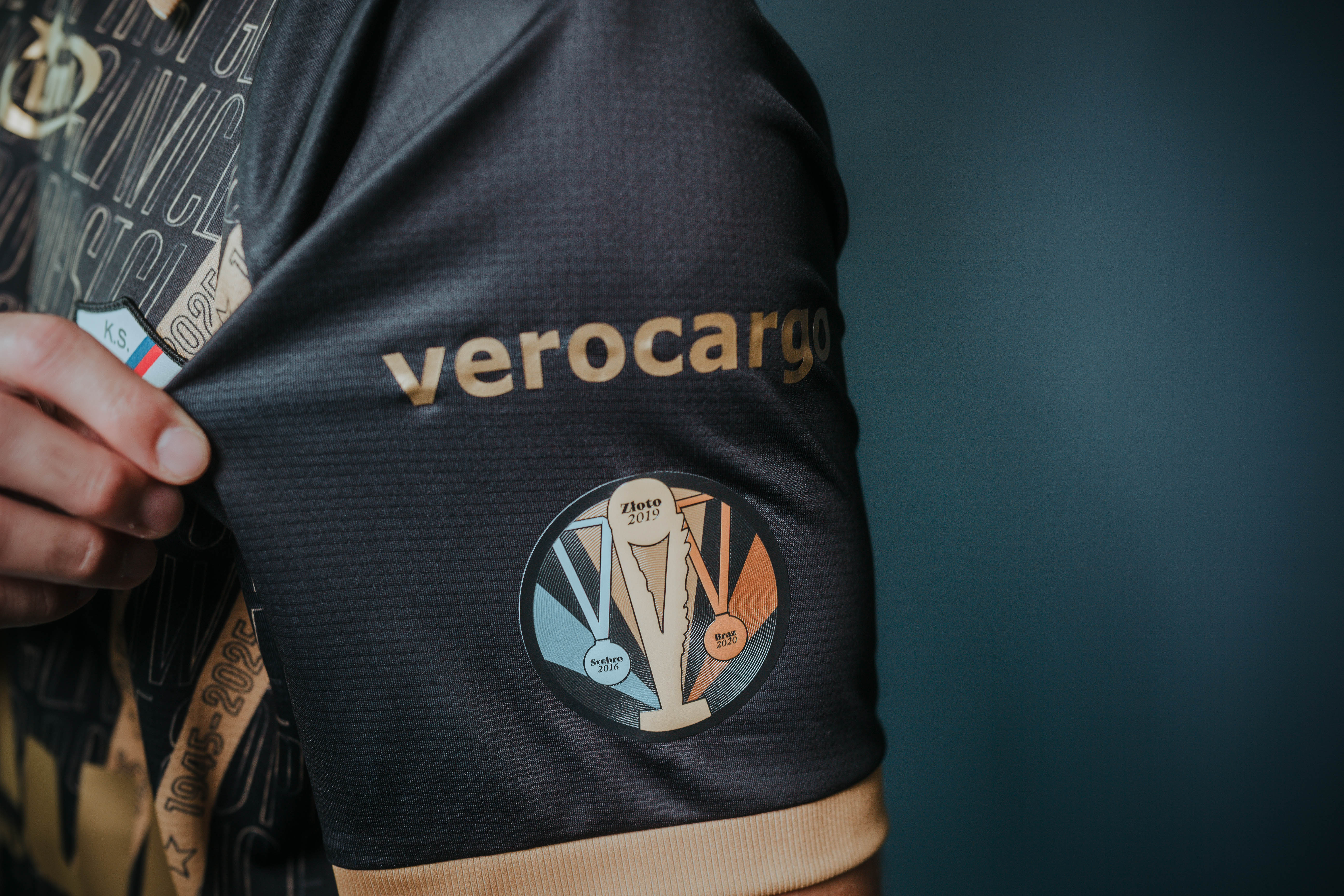 Rękaw jubileuszowej koszulki zdobi wyjątkowy emblemat, który upamiętnia największe sukcesy w historii klubu: brązowy, srebrny oraz złoty medal mistrzostw Polski. To jeden z unikalnych detali zdobiących nasze jubileuszowe trykoty.