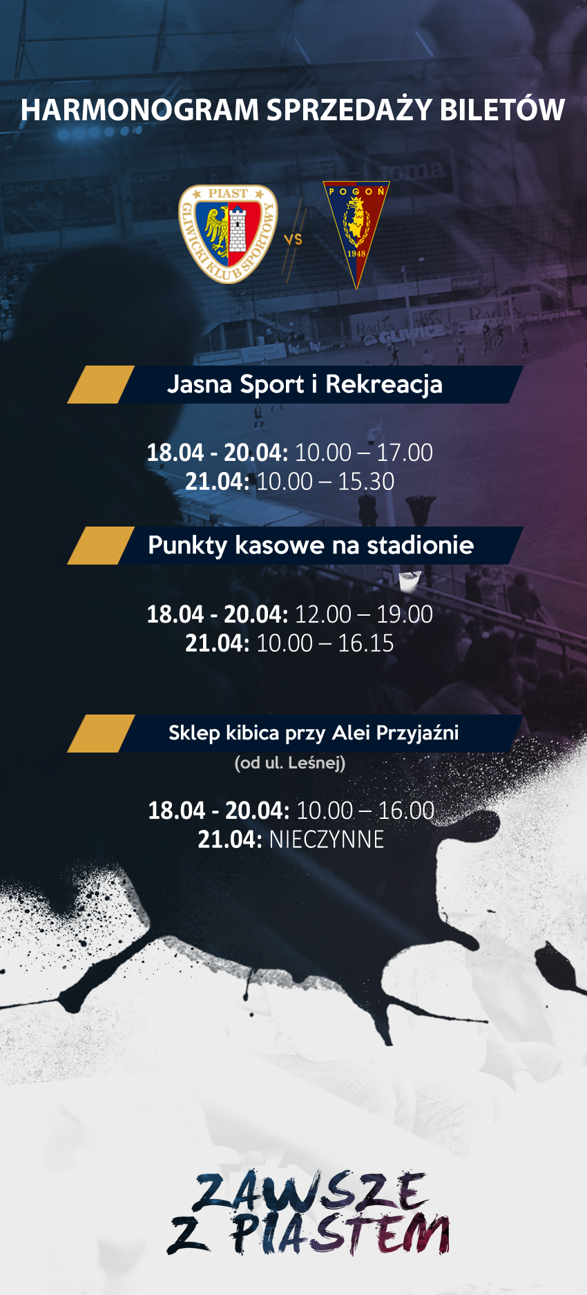 Informujemy, że stacjonarna sprzedaż biletów na mecz 32. kolejki Lotto Ekstraklasy z Pogonią Szczecin (mecz kategorii zwykłej) rozpocznie się w środę 18 kwietnia we wszystkich punktach kasowych. Bilety są już do nabycia w aplikacji internetowej bilety.piast-gliwice.eu. Wejściówki będzie można nabyć również na stronie kupbilet.pl oraz w salonach Empik. Poniżej prezentujemy szczegółowy harmonogram sprzedaży.