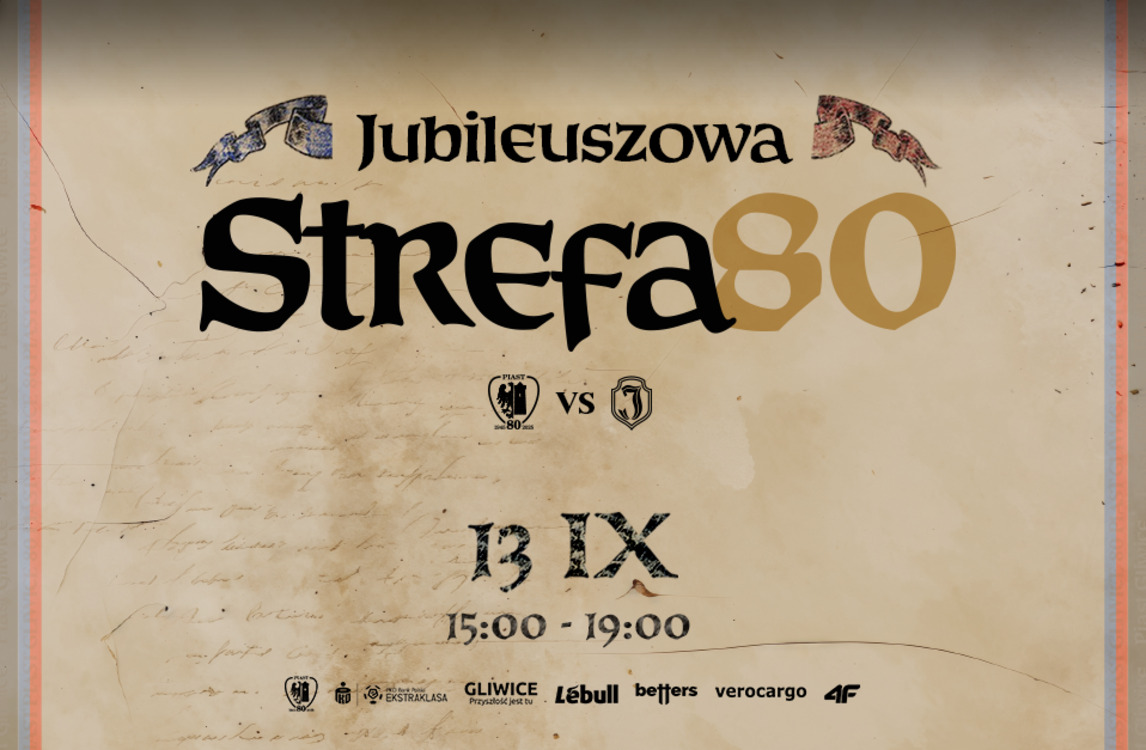 Mecz z Jagiellonią Białystok rozpocznie się o 20:15, ale już od 12:00 ruszamy z wystawą "80 lat Piasta Gliwice", a od 15:00 startują pozostałe atrakcje na Strefie80. Z jej bogatej oferty będą mogli skorzystać zarówno dorośli, jak i dzieci. Będzie możliwość wzięcia udziału w grach, zabawach i zajęciach pokazowych przygotowanych przez naszych Partnerów oraz Sponsorów. Dodatkowo na scenie głównej odbędą się spotkania z Legendami Piasta Gliwice, koncerty oraz konkursy!